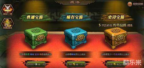 稀有战法,这3种宝箱都有产出,而且每天活跃任务也会有机会弄到蓝色战法,战法每种只需要一个即可,所有武将都可以安装和替换,抽取的重复的战法会变换成兑换点,可以兑换其他战法。