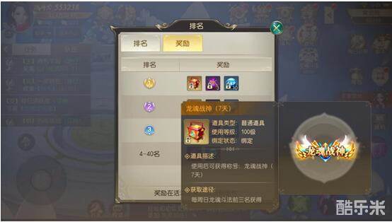 在每日龙魂斗法结束后,前40名的玩家还会额外获得龙魂斗法排行榜奖励,若获得周日的排行榜前三名的玩家还会额外得到专属称号“龙魂战神”!
