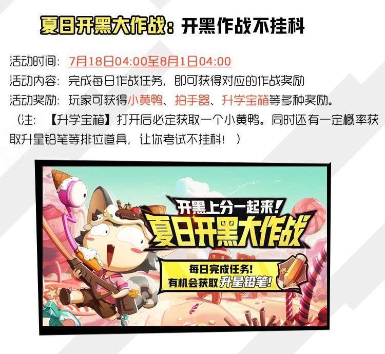 畅玩学园“夏日文化祭”,怎么少得了基友相伴呢?自7月18日4:00起,至8月1日4:00,为期14天的游戏内每日任务串,等你和基友一起挑战。只要每日完成作战任务,即可获得对应奖励,硬币、金砖、拍手器、小黄鸭应有尽有,还有惊喜送出的【升学宝箱】,有机会开出升星铅笔等神奇排位道具,达到不掉星、额外加星、勤奋值翻倍等惊喜效果。快叫上好基友,一起开黑上分赢取丰厚奖励吧!