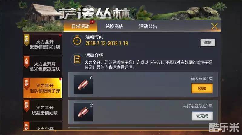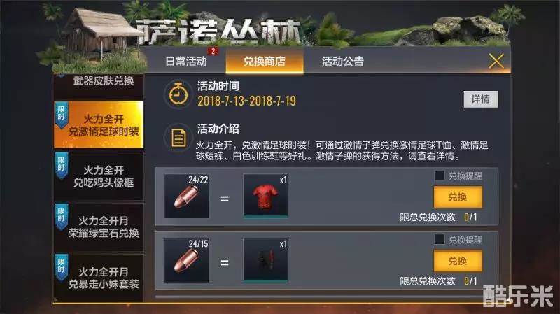 7月13日-7月19日,玩家登录游戏以及同好友组队开黑,皆可获得与次数对应数量的激情子弹,并用该道具兑换永久激情足球套装,在《绝地求生 全军出击》的战场中,享受到世界杯的狂欢气氛!