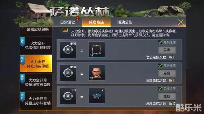 活动期间,当获取的银质出击勋章达到一定数量时,即可兑换包括吃鸡探长头像框(7天)、狂野涂装(7天)以及海军套装宝箱在内的道具奖励!