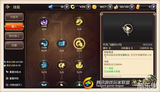 再比如说烈风飞腿这个技能,就可以加强银色猎人的空中打击能力,在银色猎人无技能可用的情况下,该技能绝对可以在短暂的时间内保证银色猎人的安全,毕竟烈风飞腿在空中可是拥有击飞效果的,而趁着击飞的这段时间谷民可以安全的撤退并且进行跑位。因此为了最大化提高银色猎人的天梯胜率,有关于辅助技能的加点就一定要全满。