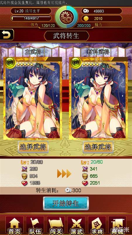 武将达到特定等级后,就可以进行转生。转生后武将阶数会升高,同时获得大量的属性提升。武将的稀有度越高,能够转生的次数就越多。