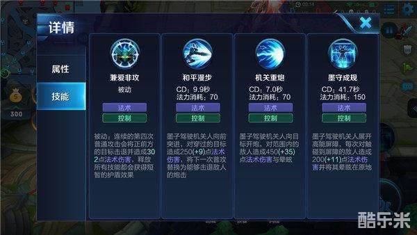 三技能“墨守成规”,墨子驾驶机关人展开高能屏障,每次对触碰到屏障的敌人造成200/250/300(+45%法术加成)点法术伤害并将其晕眩在原地。释放该技能时,墨子展开高能屏障,每次对触碰到屏障的敌人造法术伤害并将其晕眩在原地。此技能是墨子成为团控的又一重要原因,控制时间特别长。这是肉墨子最能体现作用的技能。相反因为输出墨子扛不了伤害,而且缺点就是技能易被打断,释放时要谨慎。