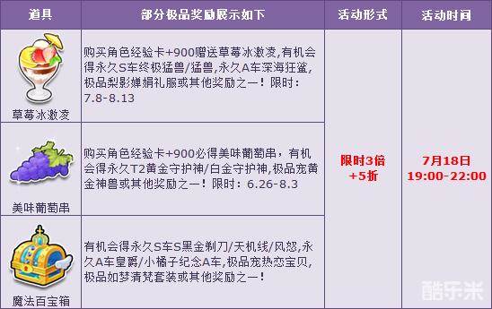 7月18日19:00-22:00期间,三款人气宝箱【草莓冰激凌】【美味葡萄串】【魔法百宝箱】限时3倍极品概率+5折,参与就有机会得永久S车【终极猛兽】/【猛兽】,千万不要错过哦!