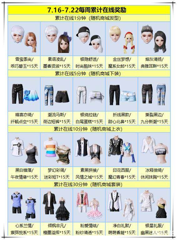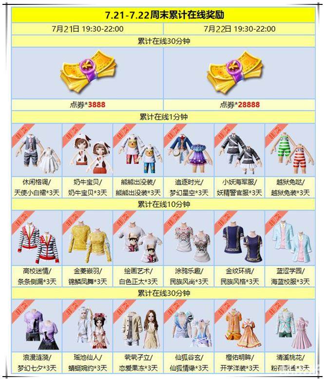 7.21-7.22,晚上19:30-22:00,累计在线1分钟、10分钟和30分钟,就能轻松领取随机非卖服饰、随机宝儿套装,以及32776点券!