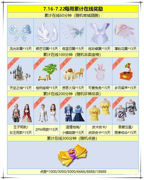 7.16-7.22,周内累计在线1分钟、5分钟、10分钟、30分钟、60分钟、100分钟、200分钟、300分钟,精美商城服饰+非卖座椅通通抱走!这么好的福利不打算pick一下吗?