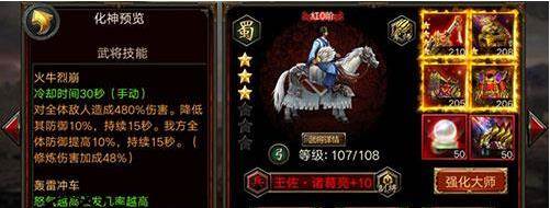 游戏中,红将化神的属性加成机制同橙将一样,唯一不同的就是红色武将进阶后仅提升技能属性,不会变色。主公们从此不用再为武将只是橙色的而郁闷了,同时也不用为红色武将达到一定程度就无法突破而烦恼。当然,“化神”玩法除了对武将等级有要求外,还需要化神丹和部分武将碎片、将魂等物品。随着主公们的化神等级的提升,需要的数量也是不同的。