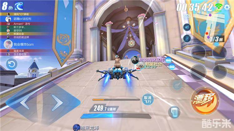 飞行:赛车手在使用飞行后会使自己的赛车变形为飞机,沿着道路自动加速飞行,没有碰撞,持续腾空飞行一段时间,腾空期间再次使用飞行技能会有额外加成。
