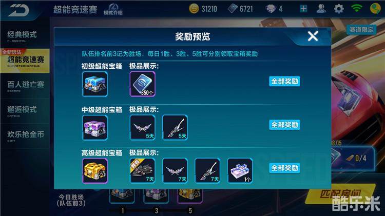 3胜领取中级超能宝箱:可以获得初级能量体*1、高级能量体*1;许愿银币*1、许愿金币*1;都市幻想科技刀(5天)、都市幻想羽翼(5天)和点卷(35-55个)