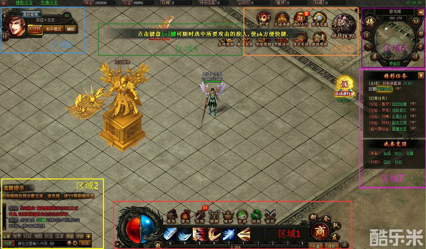 最后编辑于7年前区域①:血槽,技能和药品快捷栏,功能栏,商城,组队,好友,锻造,行会。