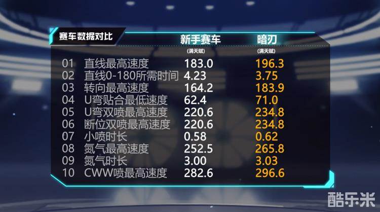 从赛车的六维性能可以看出,暗刃整体性能较为均衡,其中耐撞和转向能力最为突出,这使得暗刃碰撞时受到的影响更小,调整车头角度时更加灵活。