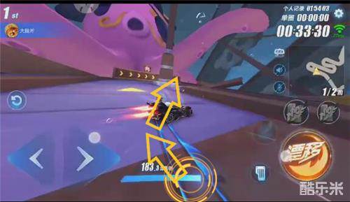 岔路出口有一个水漩涡,从漩涡处飞跃后会到达一个U型弯道。这个地方在不够熟练的情况下若使用氮气加速,容易在下个弯道因为车速过快而失误。建议在不使用氮气的情况下,朝左侧飞跃(空喷落地喷),调整角度从外侧往里侧漂移即可。