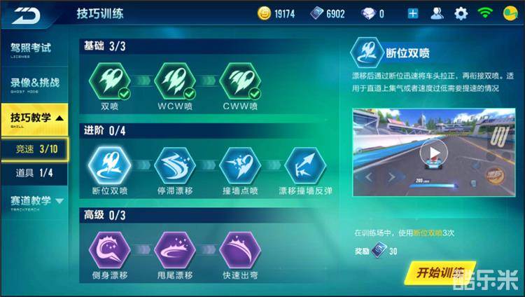《QQ飞车手游》中的技巧非常多,漂移、小喷这些都是最基础的技巧,除此之外,还有类似于断位双喷、侧身漂移之类的高阶技巧,大家不仅要学会使用这些技巧,更是要弄懂这些技巧的原理,这样在使用的过程中才能更加得心应手。这些技巧在训练中的技巧教学里面都可以学习到,而且每完成一个技巧的教学都可以获得30点券的奖励哦。