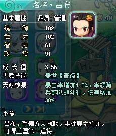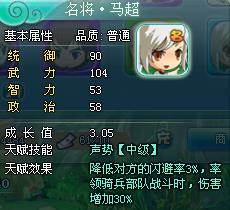 武将分为普通武将,女武将和名将三种。普通武将的属性和成长各不相同,虽然并不强大,但是是玩家游戏初期重要的伙伴;女武将非常的稀有,属性也比普通武将好,拥有一个MM是一件非常值得炫耀的事哦;名将是所有武将中最强的,不但属性高,成长也非常高,但是十分稀有,只有通过特殊途径才能获得,有的甚至不在游戏中产出,只能靠参加特殊活动获得。