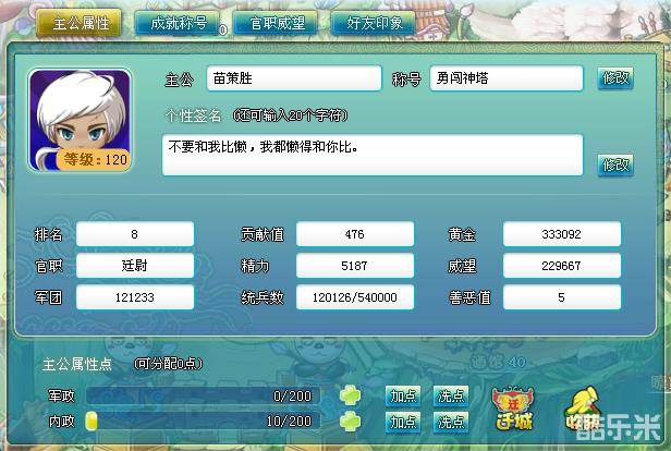 主公属性页面可以查看主公名称,更换主公称号,修改个性签名,查看各种主公信息,主公属性加点,使用主公技能。