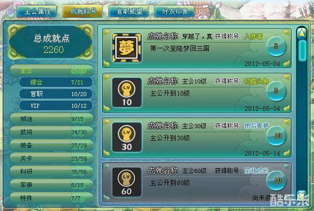 打开主公面板后,可以看到主公属性,成就称号,官职威望和好友印象四个页面。