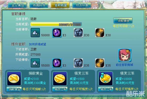 官职威望页面可以查看目前的威望值,进行官职捐献,领取官职俸禄。