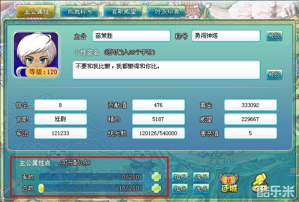 主公属性点分配:玩家可直接在属性栏中分配自己的属性点。主公每升一级,即会增长一定属性点。每个主公有内政和军政两种属性;内政属性将影响玩家的城池建设相关属性,军政属性将影响玩家的征战相关属性,玩家可视实际情况自行添加属性点。点击属性后的“+”号按钮,即可分配点数,也可点击加点按钮,同时进行多个点数的分配加点。