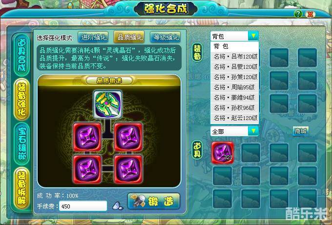 在品质强化界面选择背包或者武将穿戴的装备,每次提升一次品质需要消耗4个灵魂晶石,系统自动匹配包裹中是否含有足够的灵魂晶石,当灵魂晶石不够时系统提示包裹灵魂晶石不足。