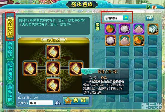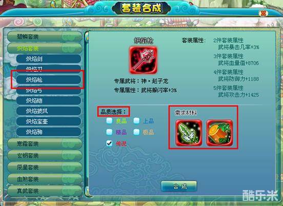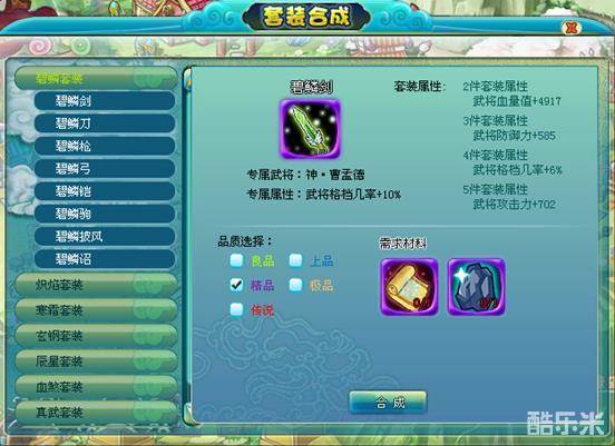 套装不能像普通装备一样使用灵魂晶石提升品质,只能通过相应品质的材料来合成,也就是说,紫色的套装要用紫色的材料合成,橙色的套装要用红色的材料合成,套装制作出来后就不能提升品质了。虽然套装不能提升品质,但是套装材料可以通过在合成界面五合一来提升品质,即五个相同的橙色材料可以合成1个红色的材料。由于制作一件套装周期非常长,所以建议玩家合成红色的材料后再制作套装。