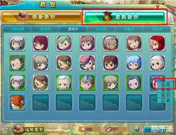 武将卡:如当前武将位置未满的情况下也可在背包内使用