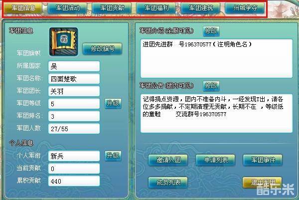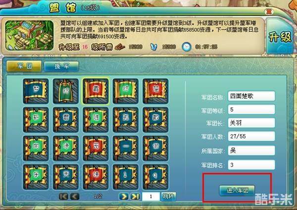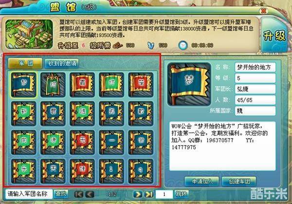 进入盟馆后,玩家可选择加入现有的军团,或者达到3级盟馆前提后自己创建军团。玩家有军团后,进入盟馆后可选择进入军团界面,在其中,可进行军团捐赠、军团贡献、古井打捞等各项操作。 点击建筑图标,打开盟馆界面,即可在界面左侧查询当前已有的军团列表。