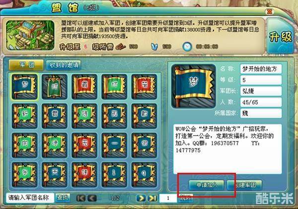 如想要加入某一军团,点击选中该军团,再点击界面下方的[申请加入]按钮,即可成功提交申请,等待该军团长允许加入。