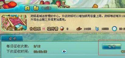 这个是最普遍的办法,主城中的府邸,本身就具备征收银两的功能,征收分普通征收和强征两种,前者有冷却时间,一天可以征收12次,后者没有限制,但是需要消耗元宝来换取征收的资格,主城中增加的人口越多,每次能够征收到得银两也就越多,另外,主公天赋点的提升,也是可以提升征收的银两数的,很需要银两的话,记得点主公天赋点的[内政],内政的点数越多,能征收到得银两就越多;