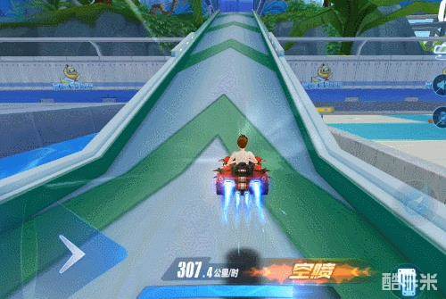 经过第一个捷径后上坡将迎来鸭鸭跳台,这处跳台在无氮气的情况下也可以直接通过。建议在到达跳台前使用一个氮气,氮气再加上高度落差的加速效果,可以更快的通过此处并起到延续氮气的效果。