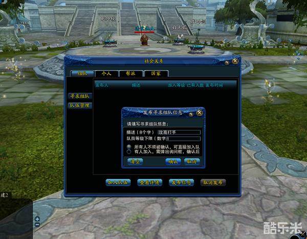 如果是想寻求组队或者查看其他人寻求组队的信息,也可以在“社会关系”一栏中查看。发布寻求组队的消息还可以填写一些具体要求,比如“高攻打手、奶妈”等等。