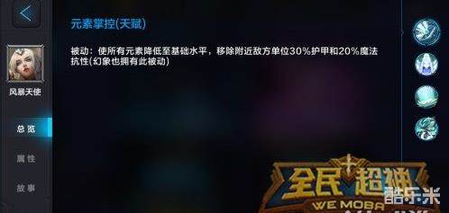 元素掌控(被动):使所有元素降低至基础水平,移除附近地方单位30%护甲和20%魔法抗性(幻象也拥有此被动)