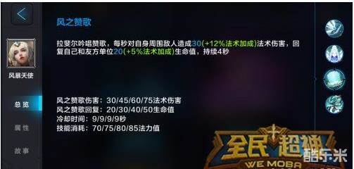 风之赞歌:拉斐尔吟唱赞歌,每秒对自身周围敌人造成30(+12%法术加成)法术伤害,回复自己和友方单位20(+5%法术加成)生命值,持续4秒。