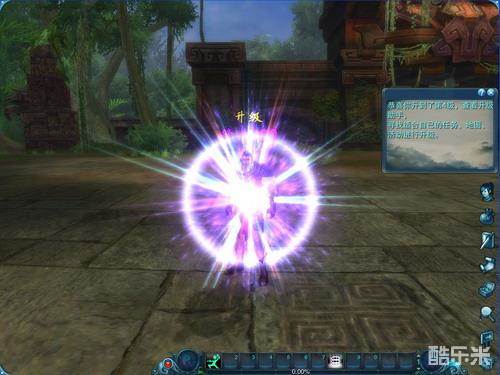 玩家升级时周身会散发出白色的光效,头上会出现“升级” 的字样,信息栏中也会提示玩家提升到的等级。