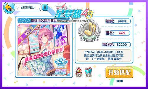 每日巡演可免费匹配10次。10次PK,10次手速与应援之心的决斗:成功则获得大量粉丝高飞星光组,失败则无缘圈内。大佬们,战斗吧!