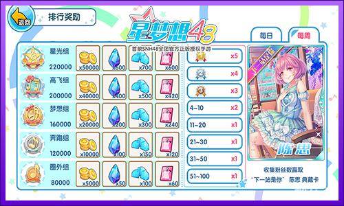 一周巡演获得粉丝数大于80000即可获得大量金币、星尘、钻石、服装券,以及SR典藏卡【下一站是你-陈思】奖励。组别越高,奖励越丰盛。
