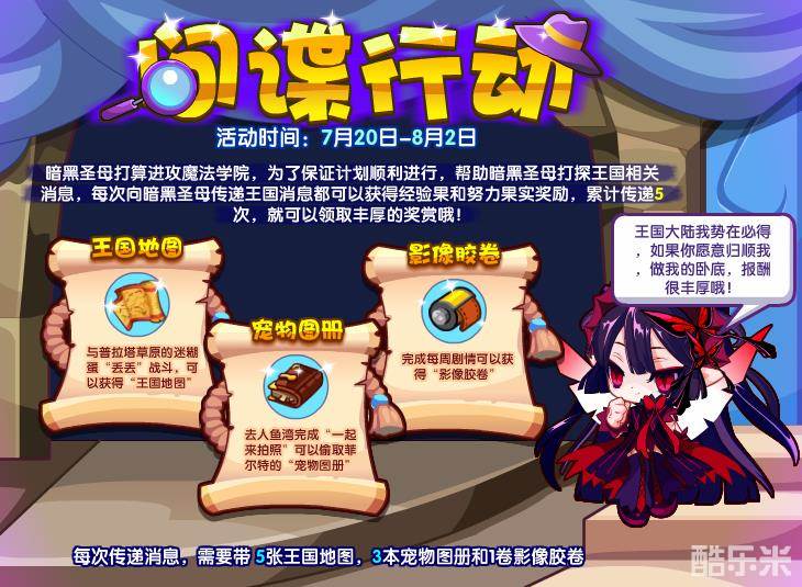 暗黑圣母打算进攻魔法学院,为了保证计划顺利进行,帮助暗黑圣母打探王国相关消息,每次向暗黑圣母传递王国消息都可以获得经验果和努力果实奖励,累计传递5次,就可以领取丰厚的奖赏哦!