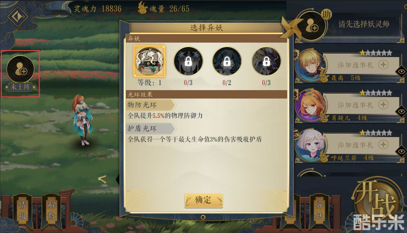 1、关卡内点击开始战斗进入备战界面。可以预设自己的妖灵师及逸事札,编辑队伍名称。对当前编队进行保存。同一队伍中无法上阵同名妖灵师。最多可以上阵5名妖灵师。