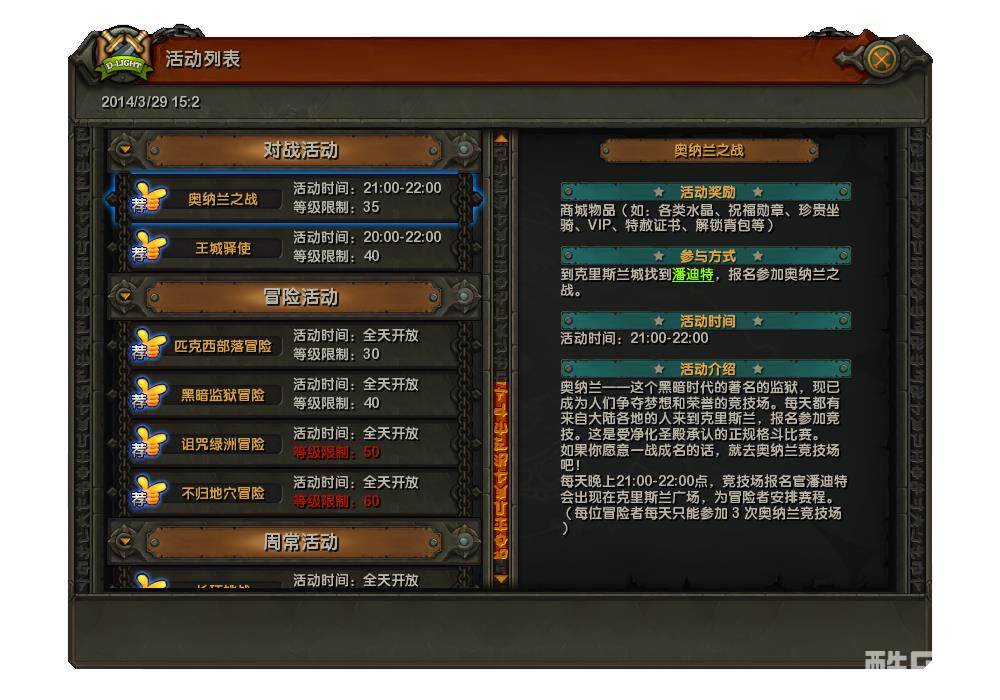 奥纳兰—这个黑暗时代的著名的监狱,现已成为任命争夺梦想和荣誉的竞技场。每天都有来自大陆各地的人来到克利斯兰,报名参加竞技。这是受净化圣殿承认的正规格斗比赛。 如果你愿意一战成名的话,就去奥纳兰竞技场吧! 每天晚上21:00-22:00点,竞技场报名官潘迪特会出现在克利斯兰广场,为冒险者安排赛程。(每位冒险者每天只能参加3次奥纳兰竞技场)
