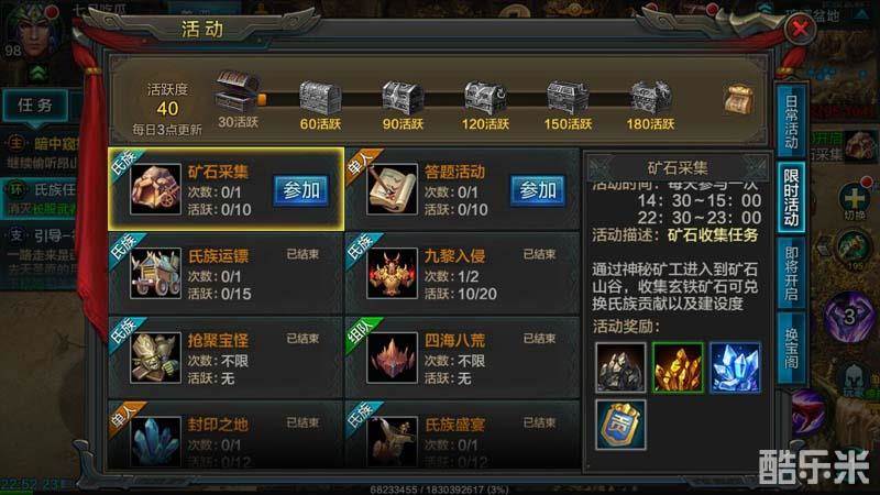 总结:每天的采矿玩法是建设氏族的重要活动之一,不仅可以获得大量的氏族建设度和氏族资金,而且还有几率获得装备精炼材料。