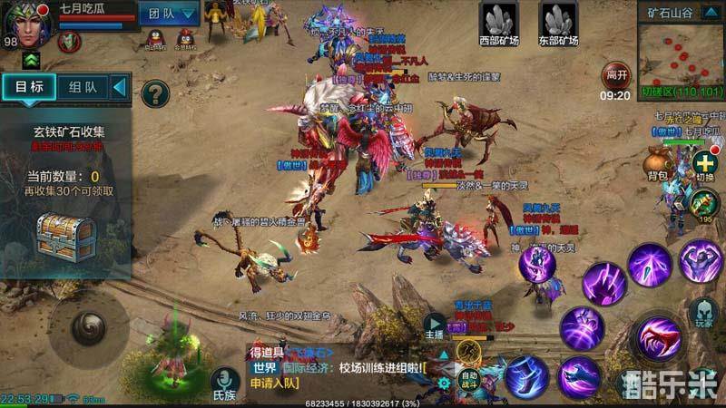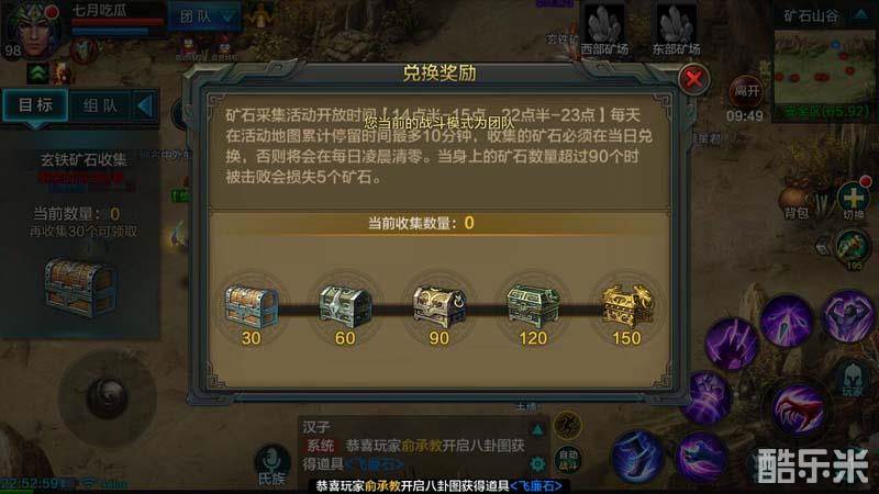 在矿区中有两种矿石:一种是在地图上随机刷新的小矿,采集后会获得3个玄铁矿石;另一种是东西部矿场固定刷新的大矿,采集后会获得20个玄铁矿。如果只采集小矿的话,在10分钟内想要采集满150个还是很困难的,而采集大矿则有机会采集到150个拿到全部奖励。由于在矿区中是可以自由攻击其他玩家的,而在身上的矿达到90个以上时,被他人击败后会损失5个矿石,因此在矿区中自然少不了一番腥风血雨。