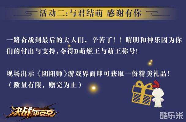 同时,为了感谢阴阳师大人们在B萌中对晴明与神乐的强力应援,在现场出示《阴阳师》游戏界面即可获取一份精美礼品!