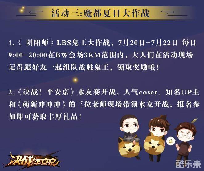 魑魅魍魉现魔都,缤纷夏日伴君行。限量无料派发,精美周边相送,更有欢乐的水友战在等待大人们的参加,7月20日至22日,《决战!平安京》在Bilibili World 2018等待着大人们的莅临