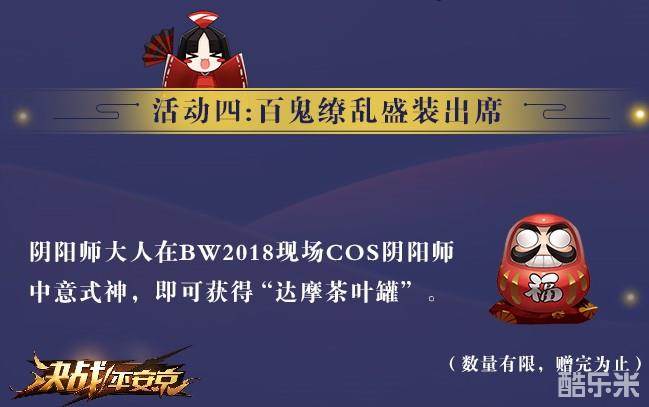 百鬼齐聚魔都,如此盛会自然也要盛装出席,各位阴阳师大人们若在BW2018现场COS平安京世界中的任意式神,即可在展台登记后领取“达摩茶叶罐”一份,数量有限,赠完为止,《决战!平安京》期待着大人们的惊艳亮相!