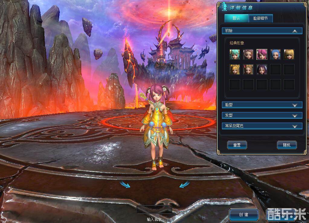3、在角色创建界面上,右边选择框有脸型、发型、特征三项基本属性可供修改,可根据自己的喜欢选择; 中间是各职业人物的展示,酷炫耀眼的装备,是否个个都让你心动?一般来说,操作比较好的玩家可以选择峨嵋,喜欢冲锋在前的建议使用武尊,而喜欢机动性强的玩家可以选择青城,仙禽、百花、灵狐都是美眉玩家最好的选择。 选完职业、发型脸型、输入完名称后,点击“创建”进入下一步。