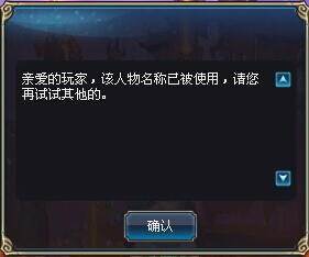 4、如果角色名字已经被别人先抢注了,系统会出现提示框如下,这样只得再想个别的名字喽。