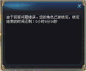 (3)、12小时内,第三次提问回答错误:提问2个问题,第一题答对则完成解答,不再继续提问;第一题答错,则询问第二个问题;若2个问题均答错,则:踢下线,帐号封存360分钟(6小时)。