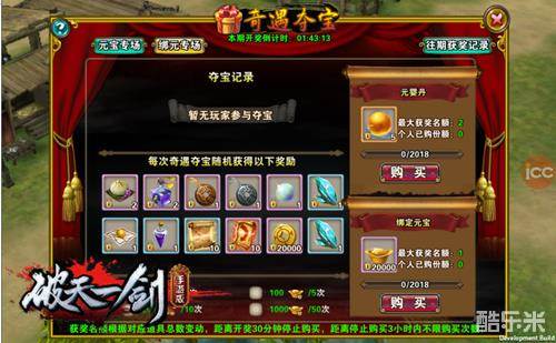奇遇夺宝玩法,会在《破天一剑》手游新服开放7天后开启。玩家可通过购买对应大奖份数参与夺宝,每次购买都能立即获得一份随机奖励,购买的份数越多,获得最终大奖的几率越大。夺宝周期为当日的21:30至次日的21:30,次日的21:30开奖后将刷新新一轮夺宝大奖。