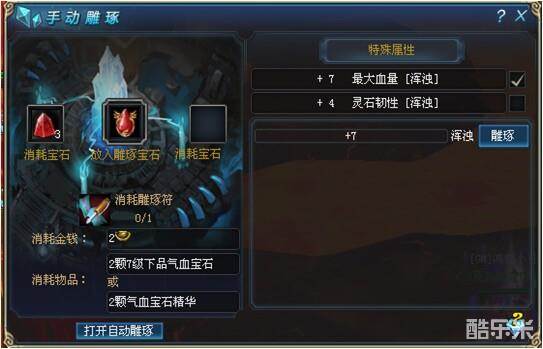 1)如下图将一个八级仙品气血宝石(第1条和第2条特殊属性都是浑浊档次)放入雕琢槽,并置入雕琢消耗必须品。