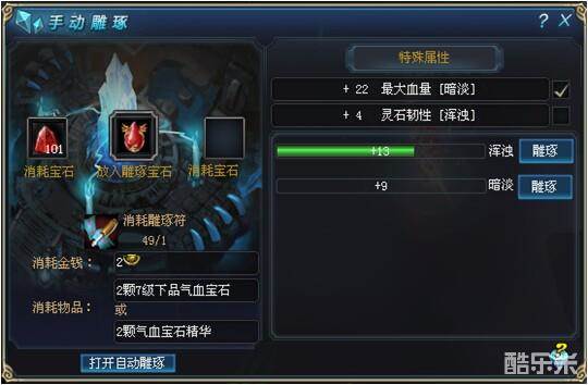 2.宝石雕琢是有几率的,雕琢成功数值提高,雕琢失败数值无变化。每次雕琢需要消耗金币、同类型下品宝石或宝石精华。只有八级上品及以上非金刚类宝石才能进行雕琢。(用宝石精华时金币不消耗)